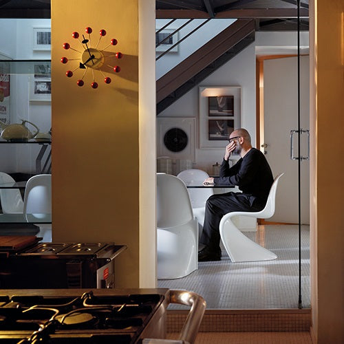 ネルソンクロックは1948年から1960年にかけて、ジョージ・ネルソンとネルソンオフィスのスタッフにより設計された、ミッドセンチュリーを代表する掛時計のコレクションであり、今日でもインテリアクロックを象徴するシリーズです。ネルソンがデザインを始めた当時、時を知ることの機能性は腕時計へと移行し始めており、相対的にウォールクロックはインテリアの一部としての意味合いを強めていました。彼は時計を読む人の動きを詳細に分析し、人が数字を読んでいるのではなく、針の相対的な位置関係で時刻を認識していることを明らかにし、既成の概念に縛られない自由な発想の壁時計を数多く生み出しました。